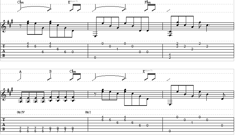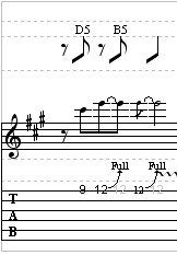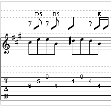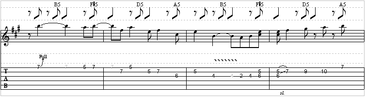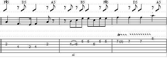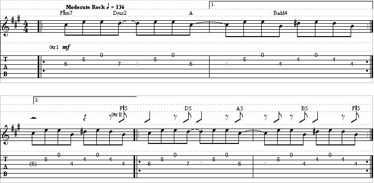 There will be a trill in here, in the third measure of the lead guitar part. You can listen to the audio to hear how long the trill should be…” trilled.” A trill is performed by rapidly hitting the note in parentheses while anchoring your finger on the fret listed in front of it. Just use your 1st finger to anchor the fifth fret, and trill on the seventh fret with either your 3rd or 4th finger.