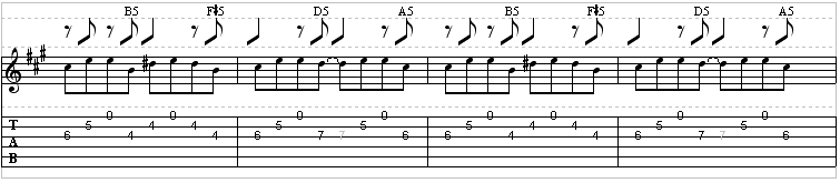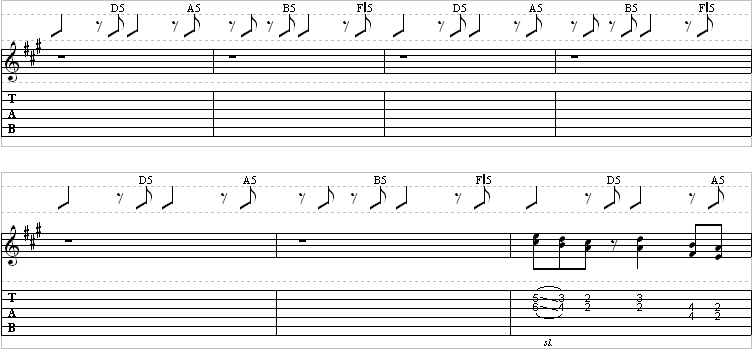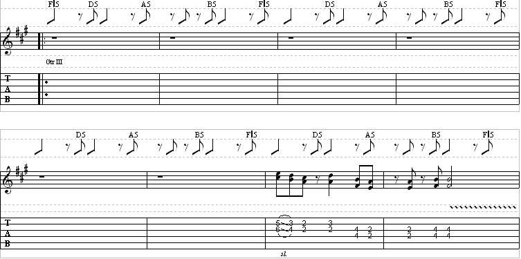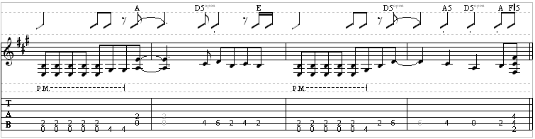 Watch for the palm mutes, noted as PM on the staff. They are important in playing correctly, as they drop out in certain spots, creating dynamics. Also, watch for the dotted notes!