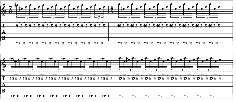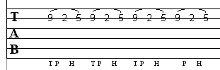 In the example below, you can see that it is a 3-note pattern repeated. The 1st note is performed by tapping on the fretboard with your picking hand and pulling off onto the 2nd fret which is fingered with the fretting hand (we suggest your 1st finger). The last note in the pattern is performed by hammering on the 5th fret with the 3rd or 1st finger of your fret hand.