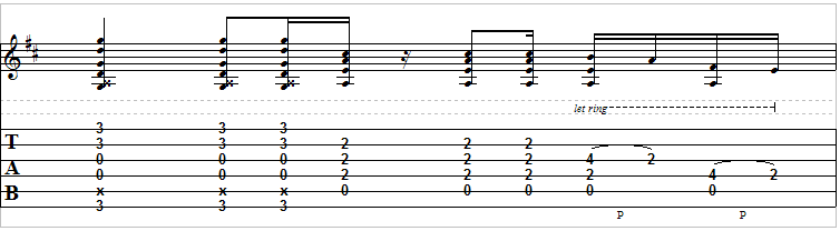 Here is a rather easy riff to play. The song is 82 bpm (beats per minute) and will help you work with your pull-offs. Remember that a pull-off is when you go from a higher note to a lower note, only striking the first note on the string being played.