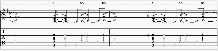 Each riff in this song begins with the previous measure. I know that sounds confusing, but it’s not really. Not when the song starts looping. Below you’ll notice that the first power chord in the 1st measure is a light gray color. That’s because the notes have been held over from the previous measure. Since the four measures of the riff loop over and over the previous measure would be the 4th measure.