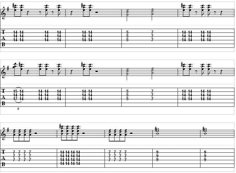 Measure ten – play this by barring any finger on the fourteenth fret on all strings except the two “E” strings.
