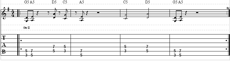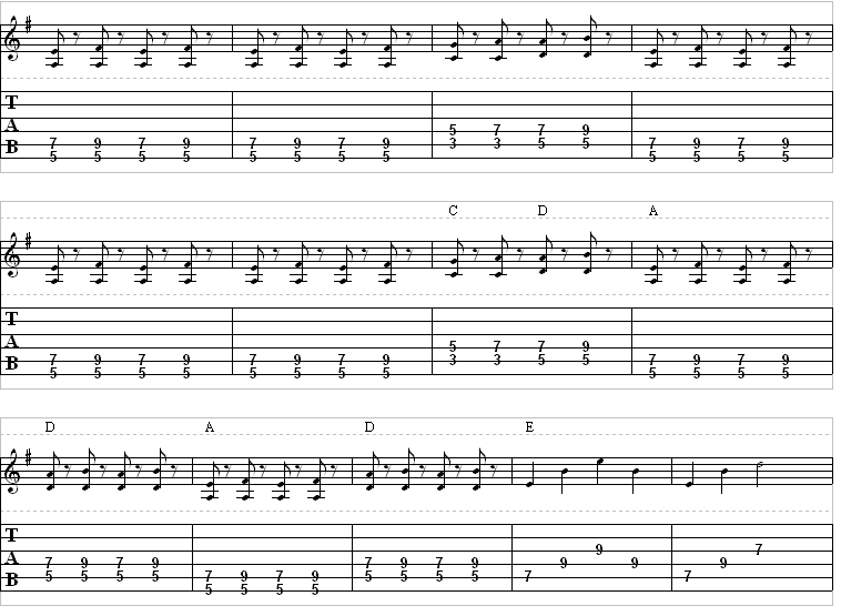 Here is a breakdown of all the identical measures – Measures one, two, four, six, and eight – play these measures by using any finger to barre the fourteenth frets on the “D” string,