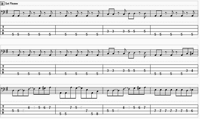 Measure twelve – To play the last measure of the bass part, place your 3rd finger on the seventh fret on the “A” string. Then, after you have played that a little, use your 1st finger to play the fifth fret on the same string, and then use your 2nd finger to play the sixth fret on the same string.